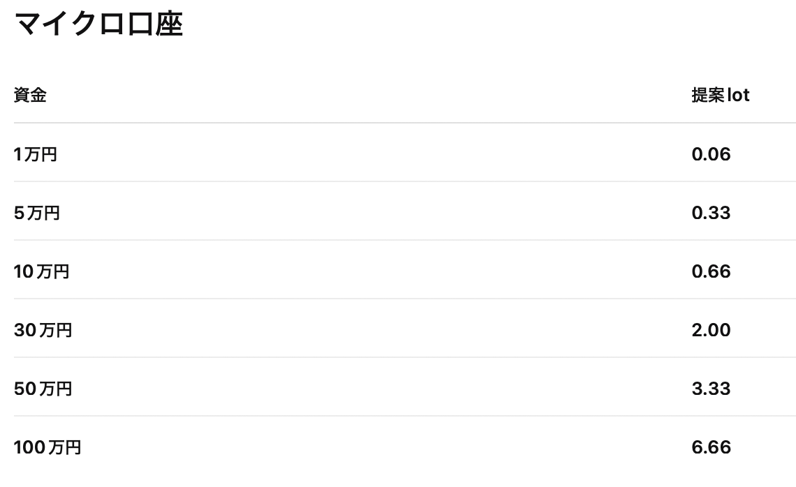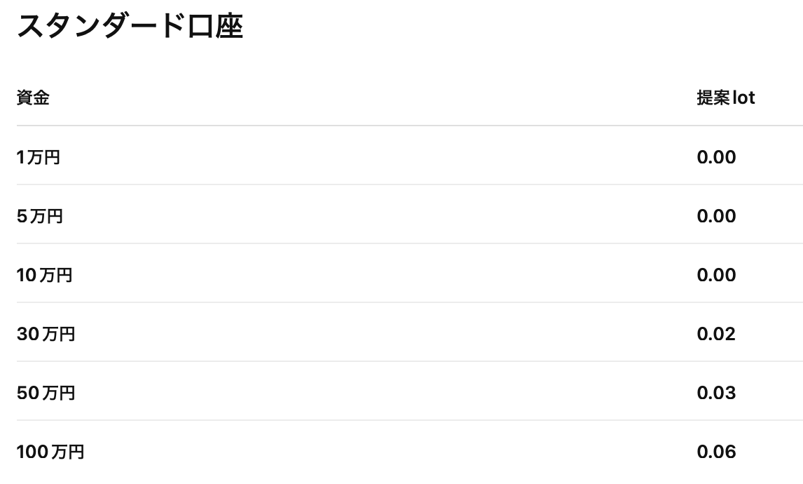 スタンダードは30万円以上推奨。100万円なら 0.06 ロット。マイクロは 1 万円から段階増が可能です。最低資金はいくらですか?