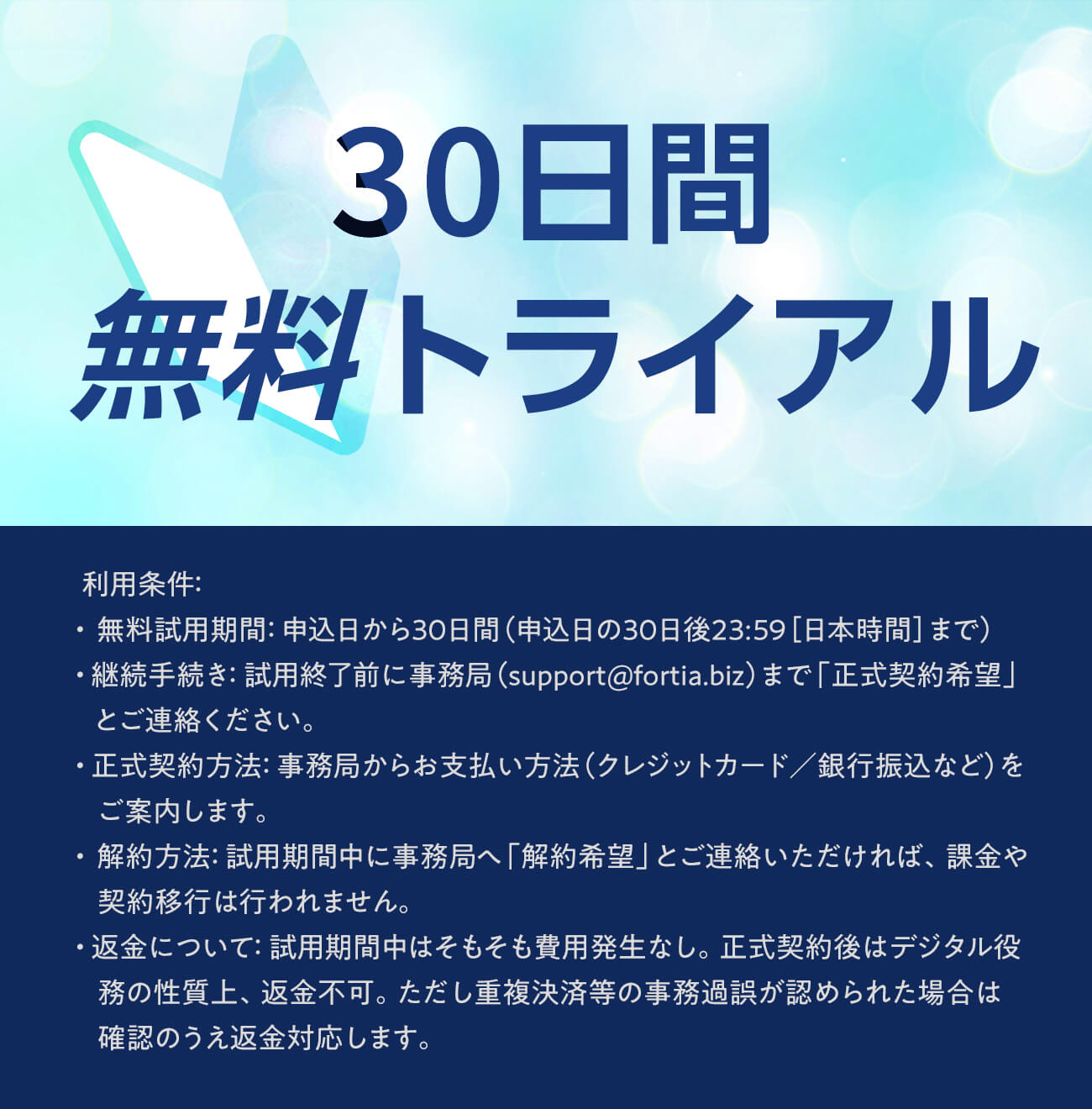 ※本サービスは無料試用期間に十分ご検討いただく設計のため、正式契約後の返金は原則不可です。当社起因の重大な不具合がある場合を除きます(返金ポリシー参照)。