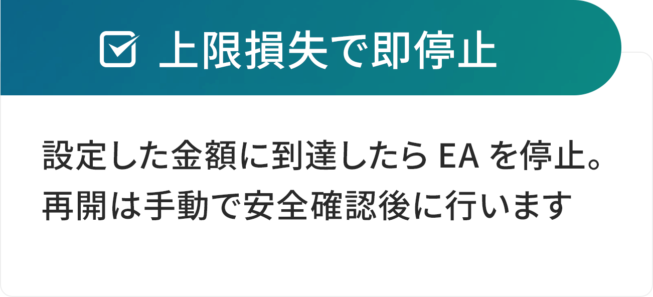 重要指標・ゴトー日・月初月末を自動停止、上限損失で即停止。DD(ドローダウン:一時的な落ち込みの大きさ)は停止ルールと上限設定でコントロールします。安全面はどう管理しますか?