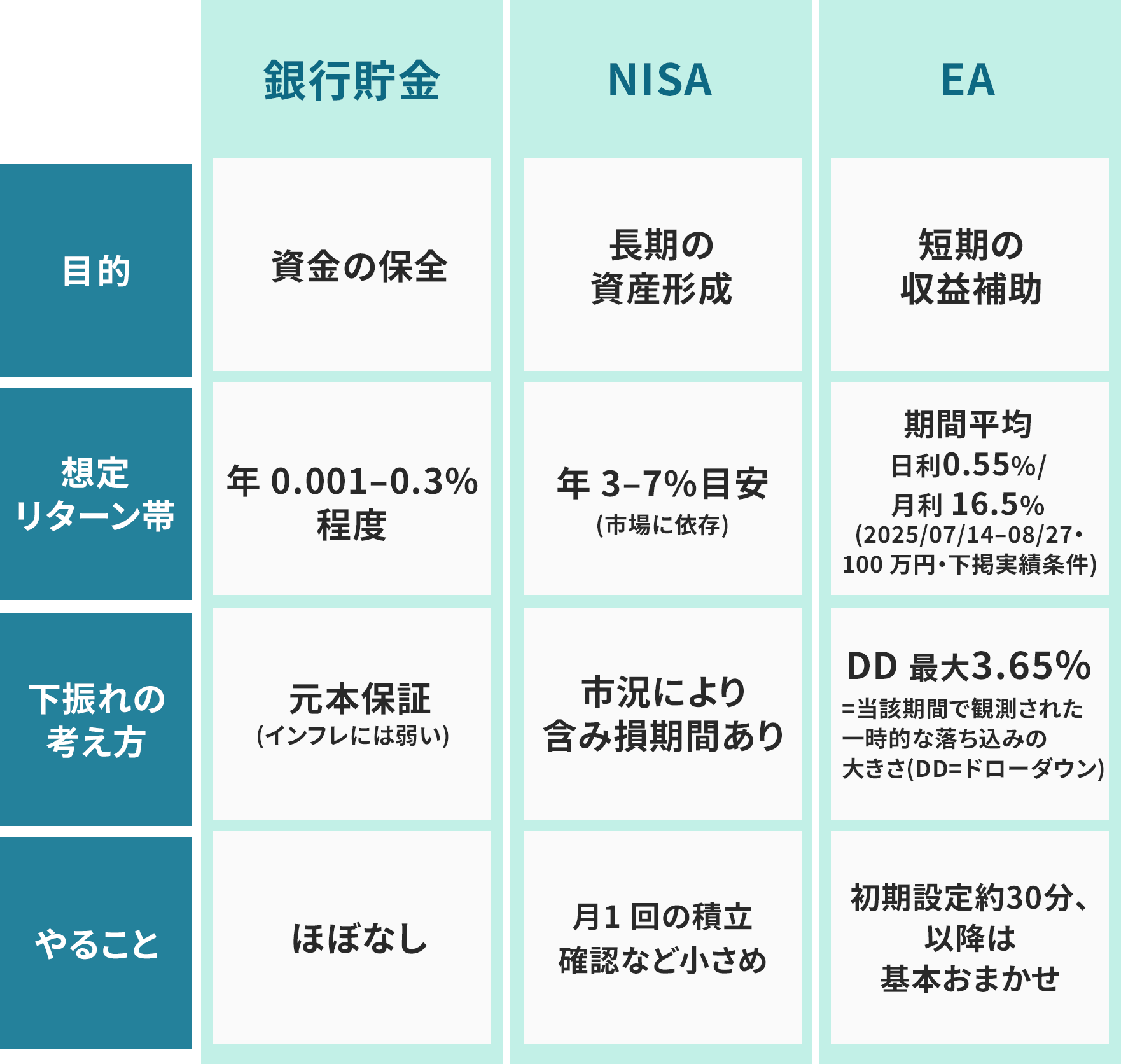 銀行・NISA・EA の役割早見表