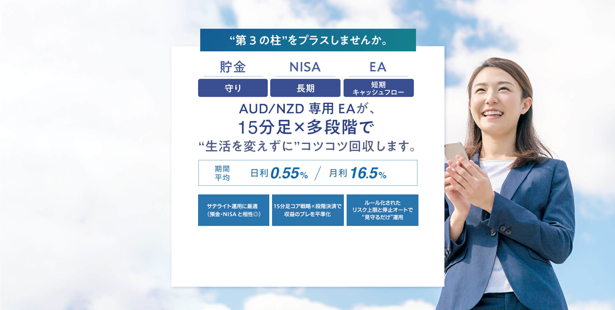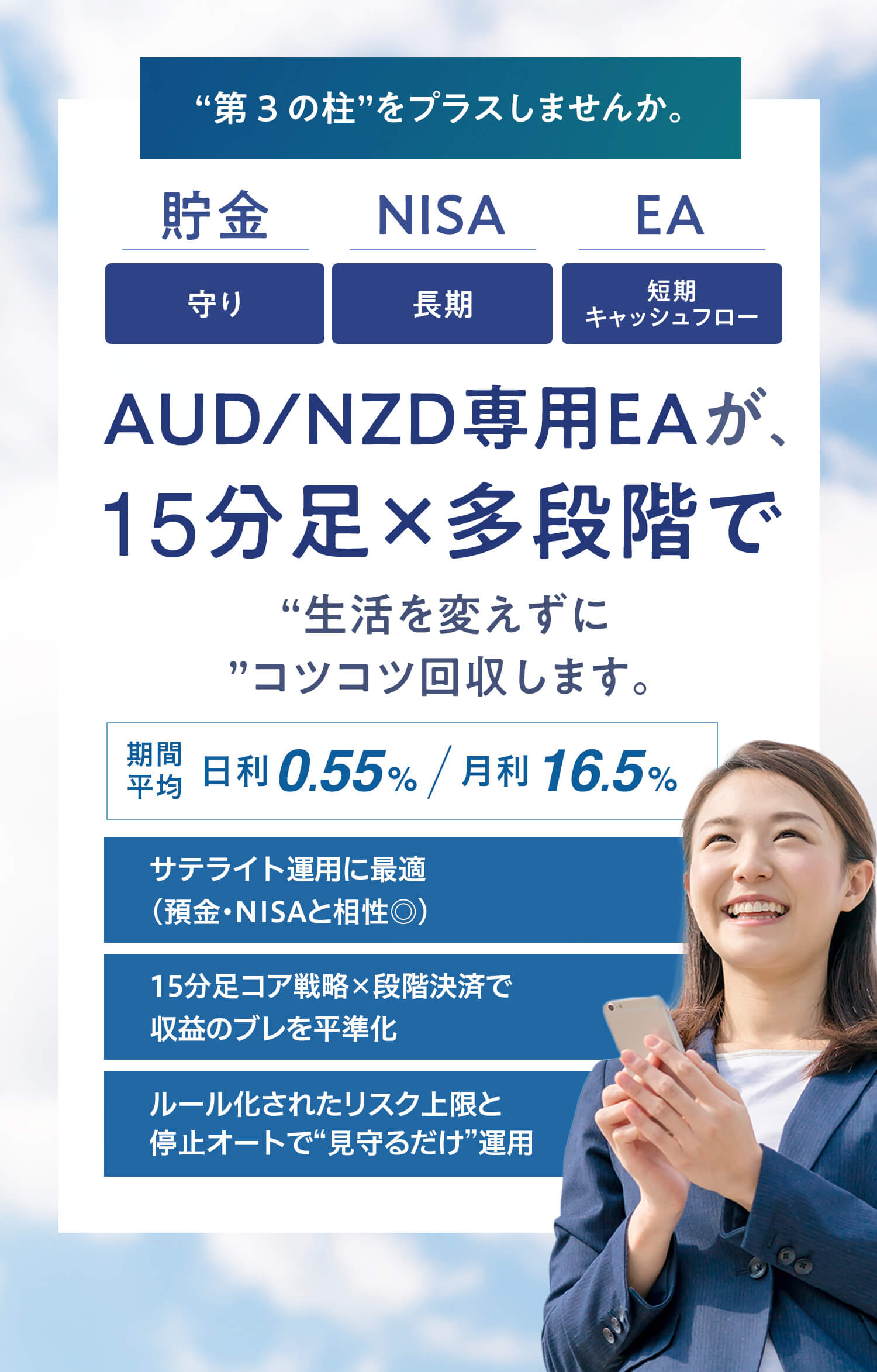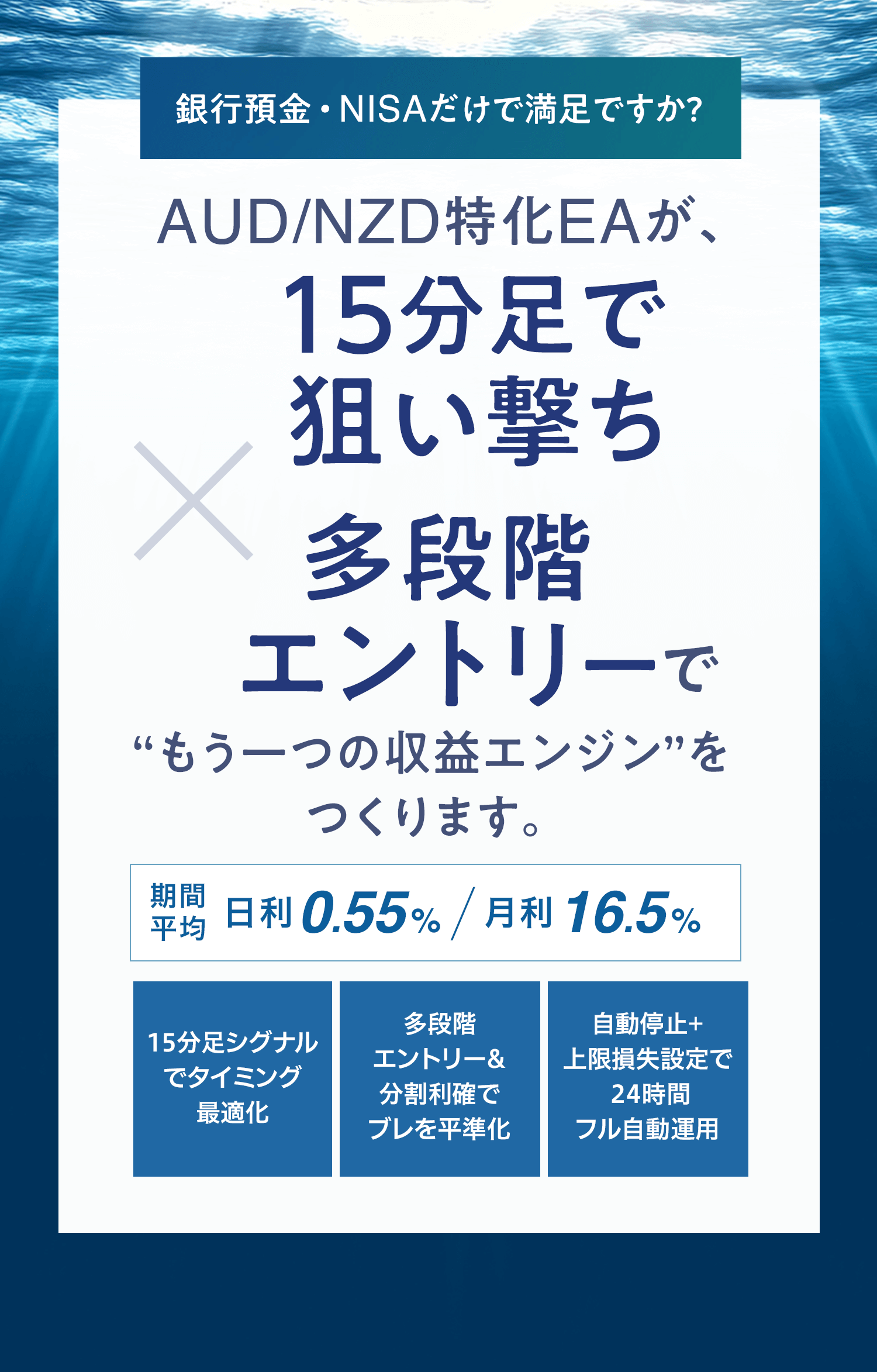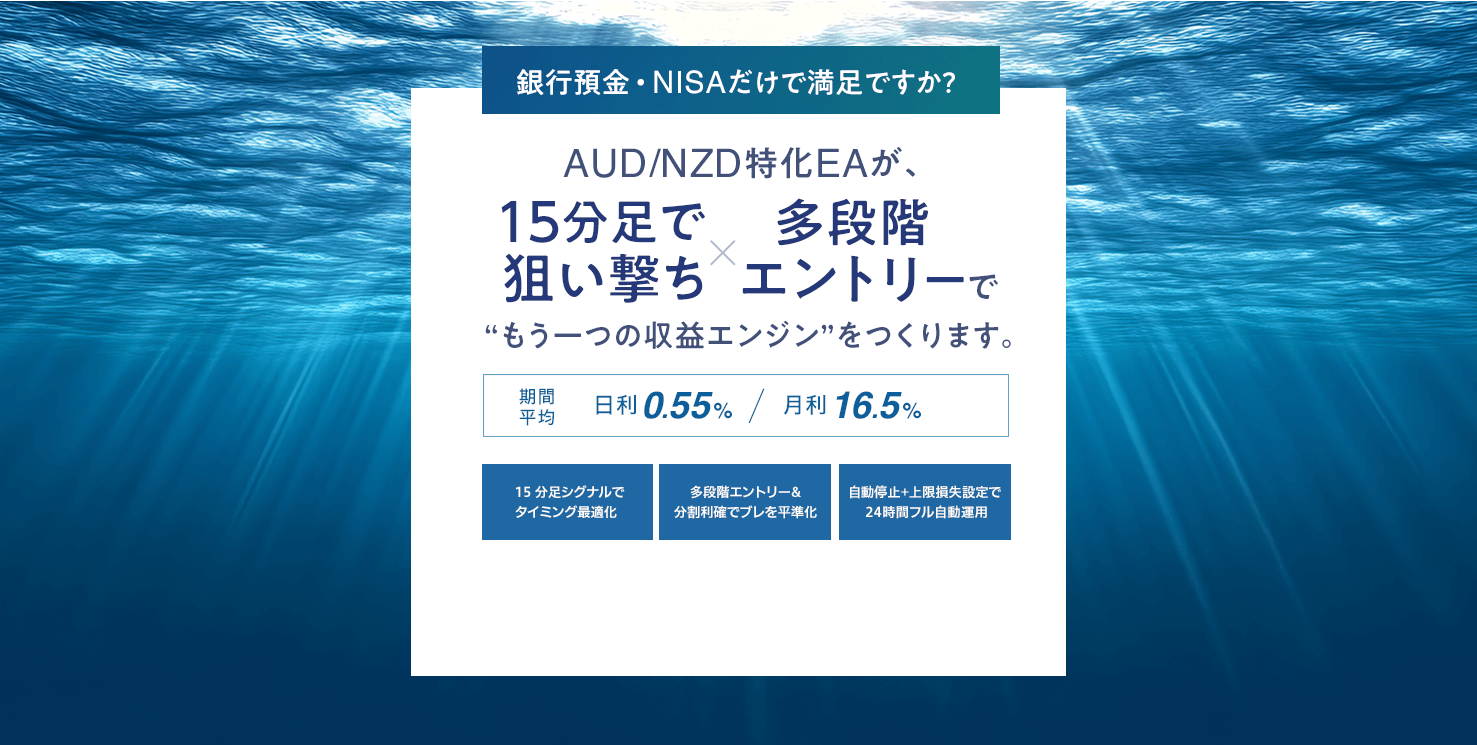 異なる戦略・時間軸を組み合わせることで、一つの相場環境での不振を他のEAがカバー。安定した収益が目指せます。